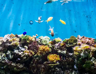 a group of seahorses are swimming in an aquarium