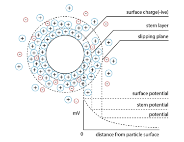 One of the important properties of nanobubbles is the electrical charges on the bubble surface which determines the interaction of nanobubbles and how they interact with other materials such as solid particles or oil droplets. The electrical potential of a particle in a colloidal system can be expressed by the Zeta-potential.